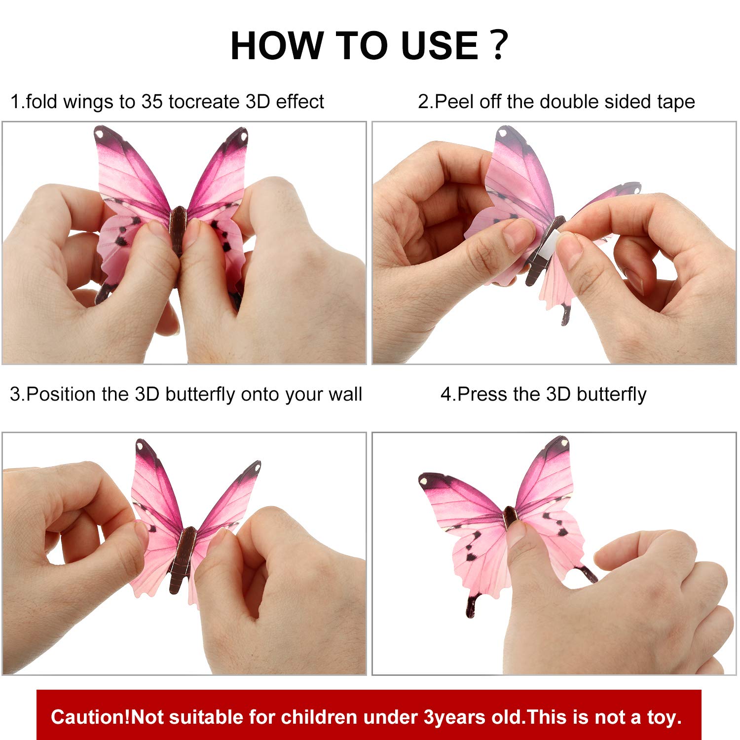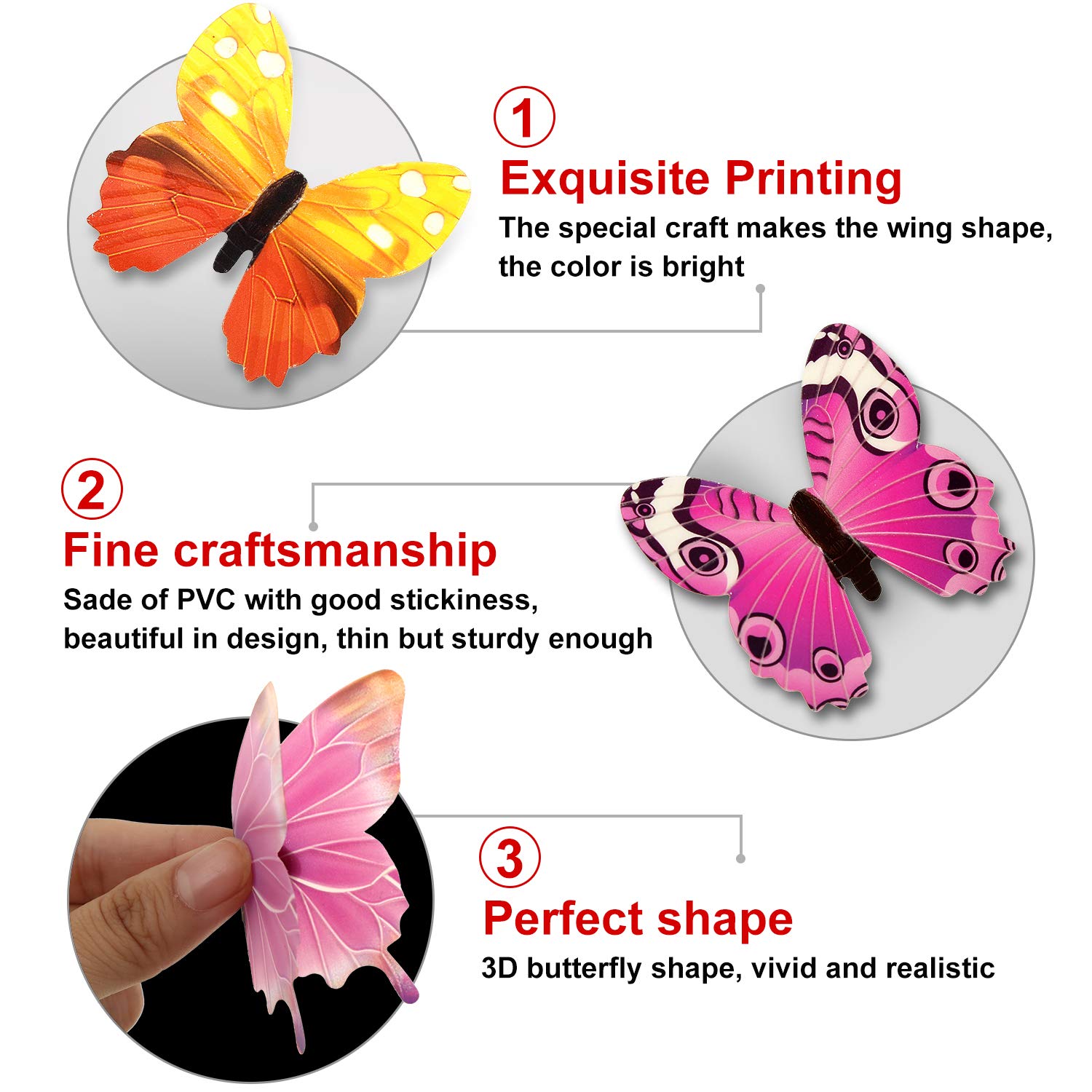 • Package included: each pack contains 96 pieces of 3D butterfly wall stickers in different styles, coming with adhesive tags which allow you paste to the wall quite well, a variety of size and large amount that can satisfy your different decoration needs