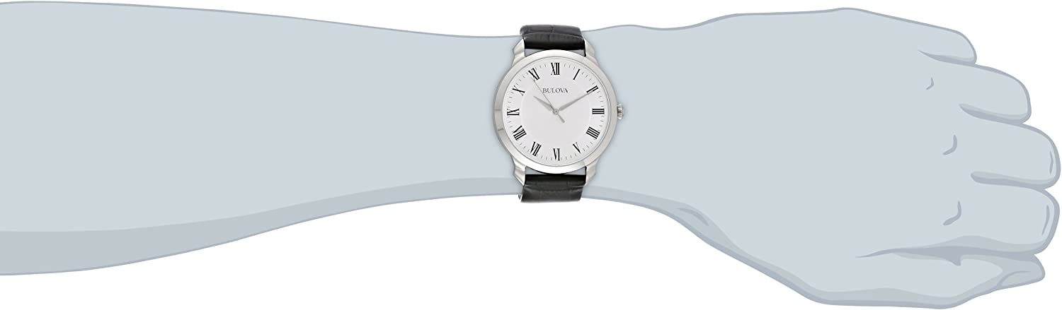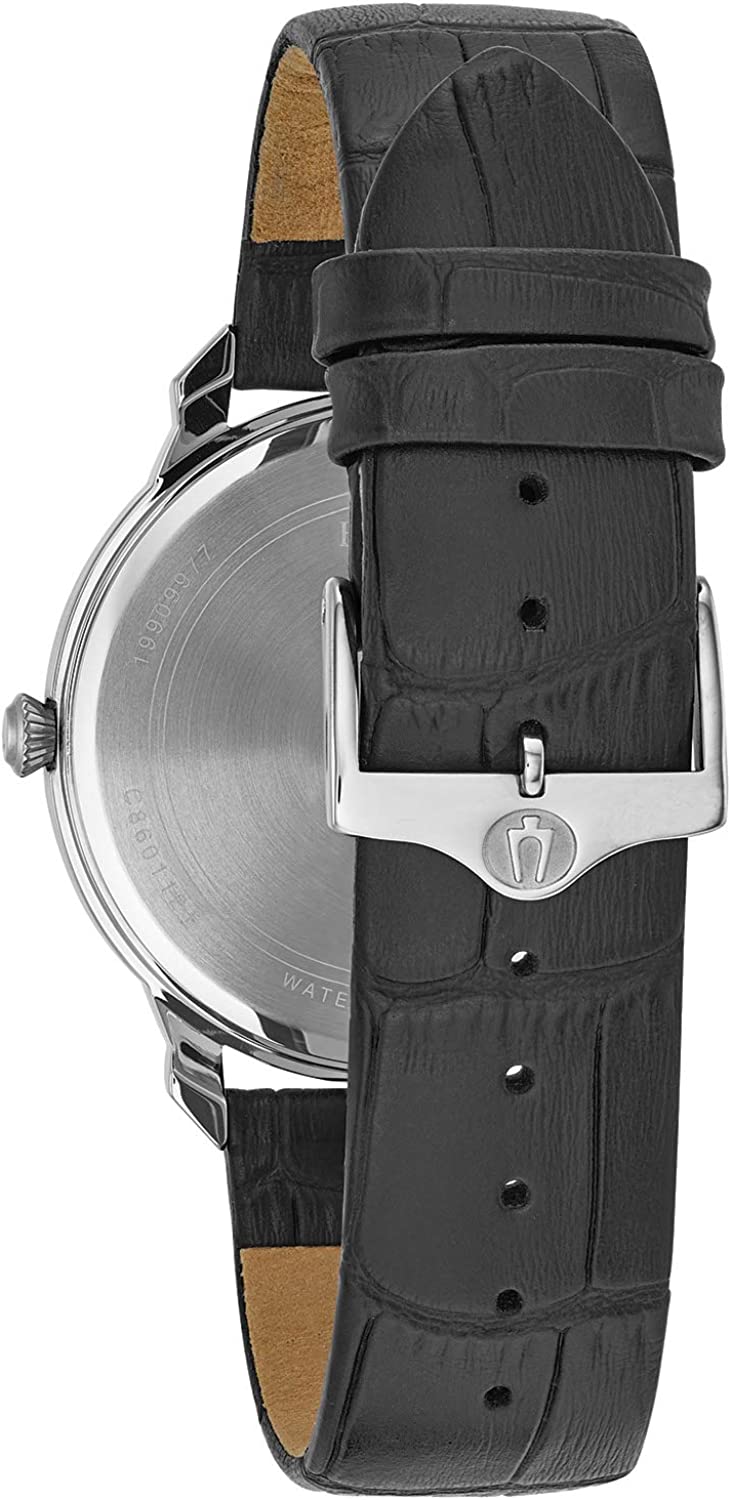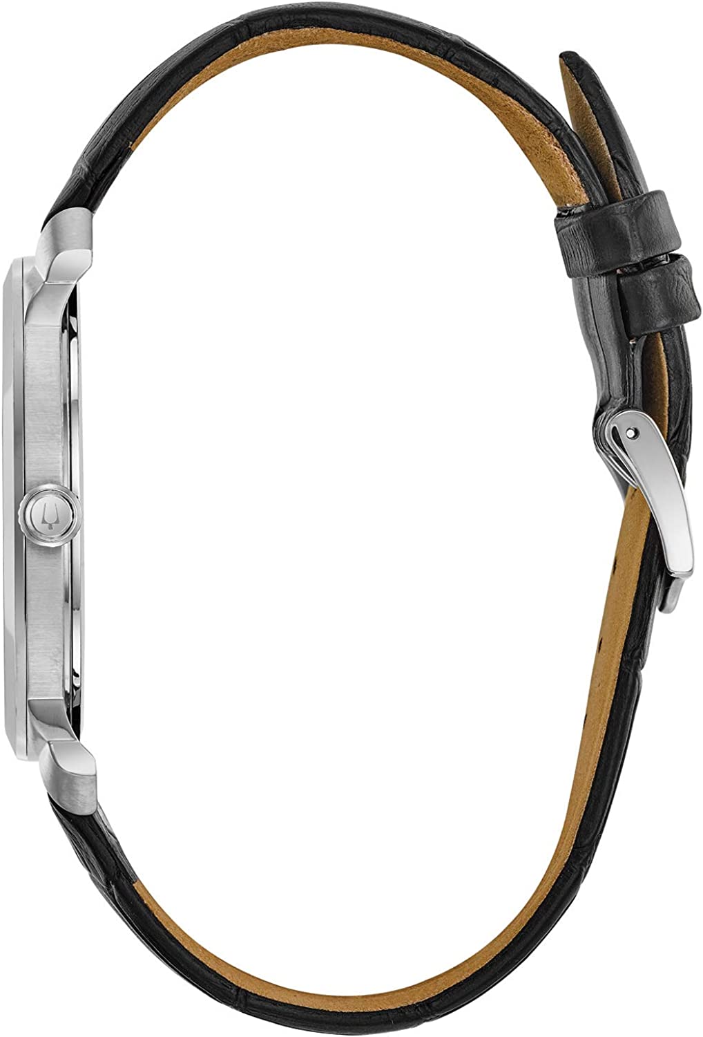 From the Classic Collection. In stainless steel with silver-white sunray dial, second hand, and black leather strap.