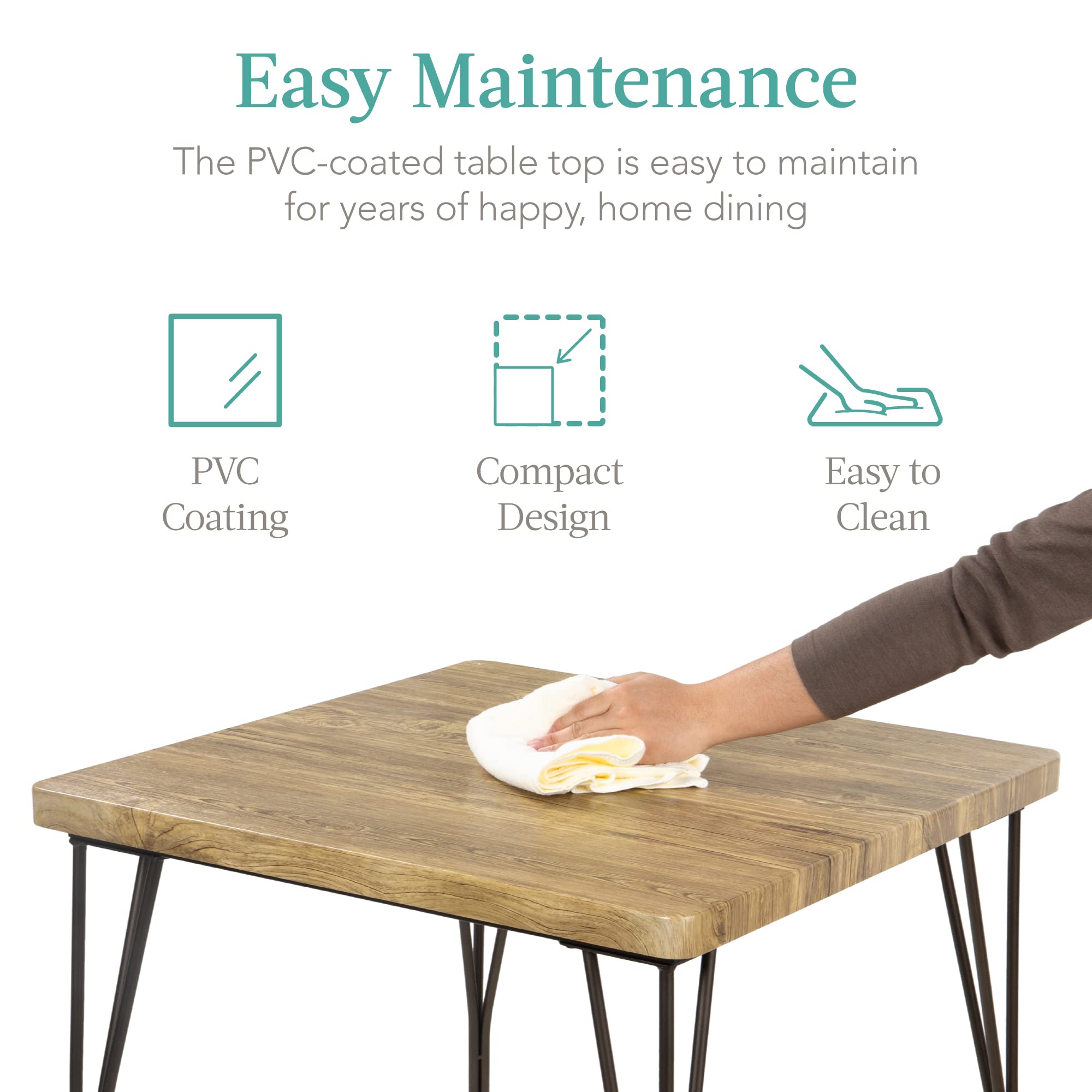 • EASY TO CLEAN: A metal frame with wood seats and PVC-coated table top is easy to wipe clean when there are spills or messes