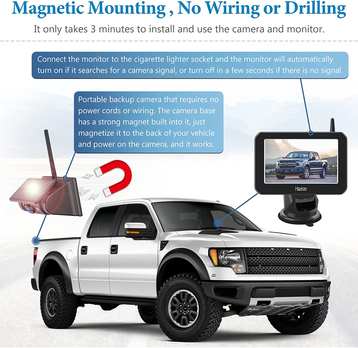 - 【PORTABLE DESIGN】 Featuring a built-in battery and compact size, this magnetic camera wireless backup camera system is easy to carry and can be used anywhere you need it. The magnetic camera base allows for quick and easy installation and removal, making it a versatile and convenient option.