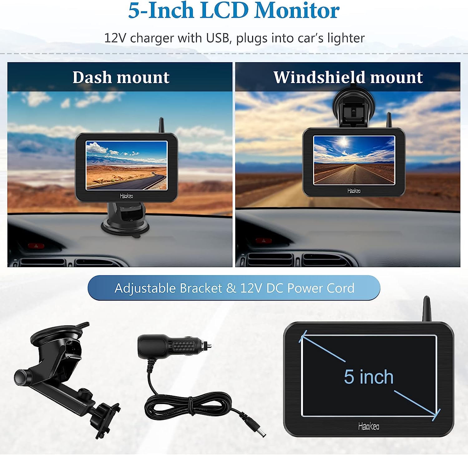 - 【5” Monitor with Guideline】The Monitor can be turned on and off with the guideline. The 5″” Monitor maintains vivid images and excellent color accuracy to ensure the best driving/reverse experience. The monitor comes with a 12V charging port, which can be plugged directly into the cigarette lighter or into the fuse box via the included power cord. (The monitor also automatically blacks out to save energy when no camera signal is searched for)