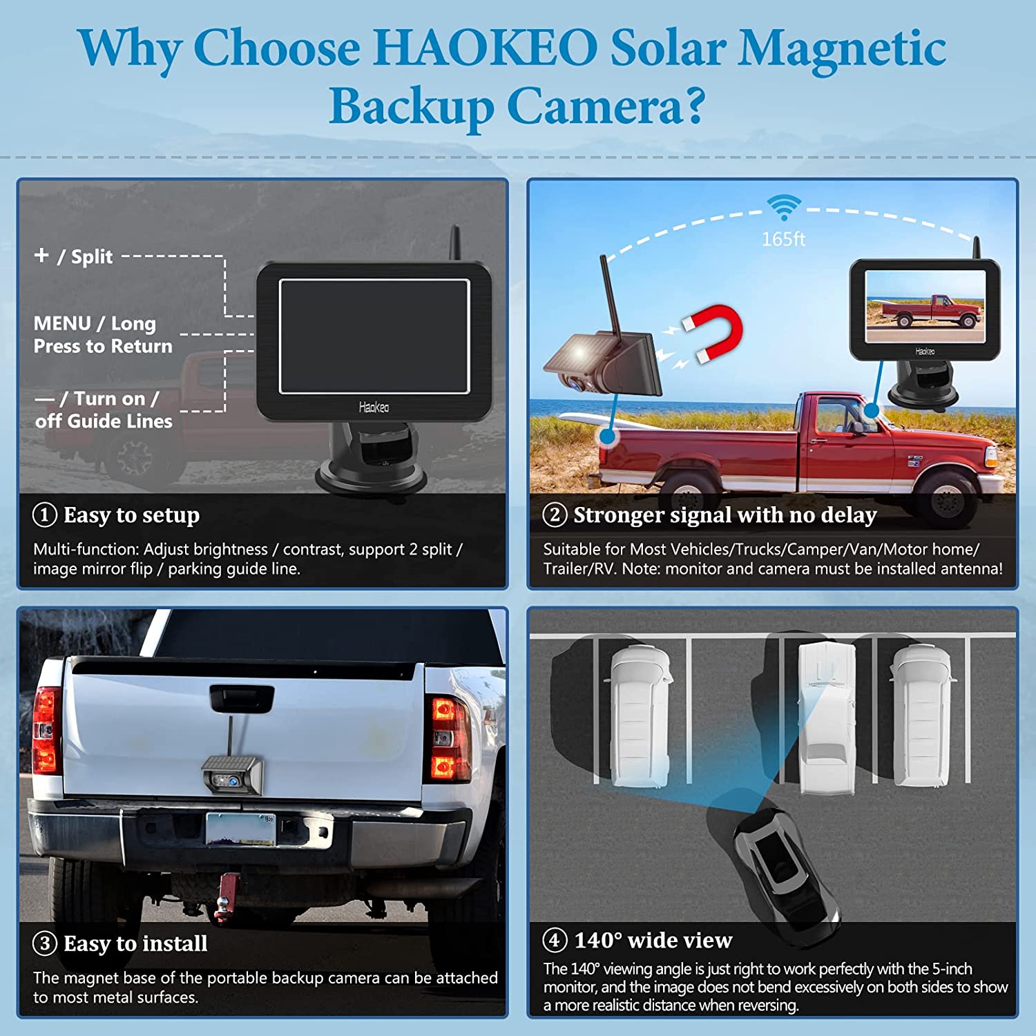- 【5“ Split Screen】Wireless battery-powered camera with a screen display. You can use the wireless reversing camera of the Pickup truck as a trailer’s rearview camera, or use it as a front/side camera.