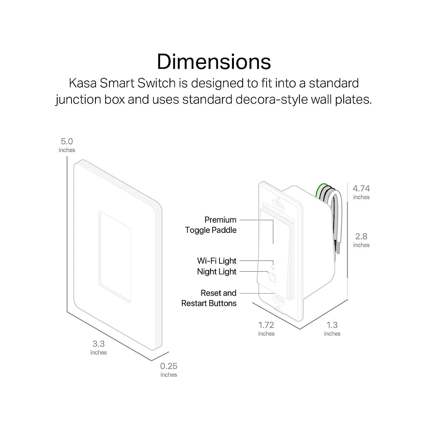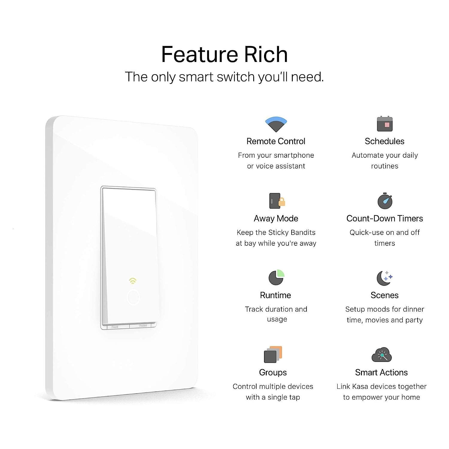 Control your lights, ceiling fans, and other fixtures from anywhere with the HS200. The smart switch replaces any standard light switch, and connects to your home Wi-Fi in no time through the free Kasa app. Kasa also lets you manage connected fixtures with your smartphone or tablet, including setting schedules, timers and countdowns. For added convenience, you can use your voice to control the HS200 when paired with works with Amazon Alexa, Google assistant and Microsoft cortana.Input Voltage: 100 – 120 VAC, 50/60 Hz, 15 A.