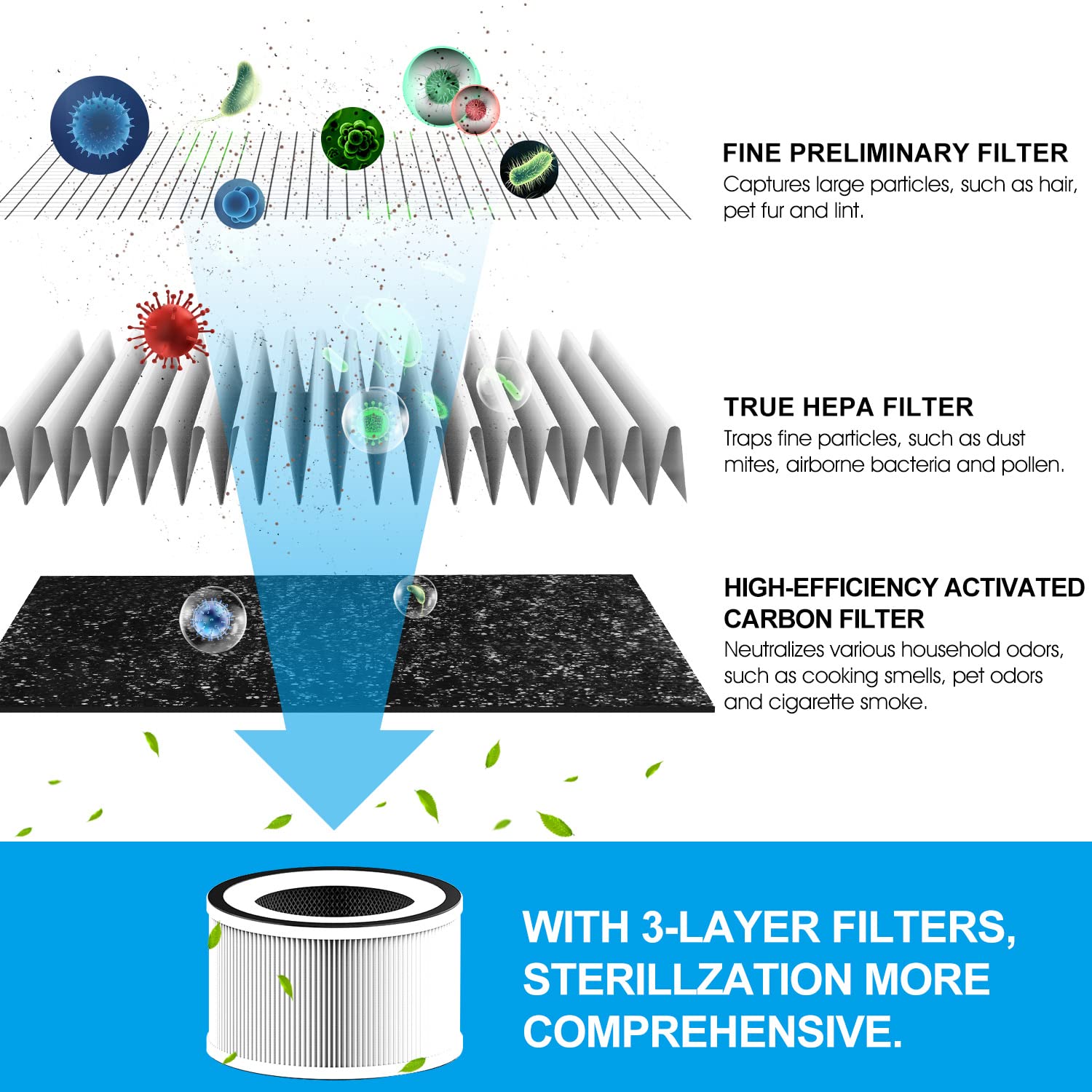The preliminary filter, H13 true HEPA filter, high-efficiency activated carbon filter captures allergens, pet hair, dander, smoke, odor, and large dust particles, in addition to removing all airborne contaminants as small as 0.3 microns.
