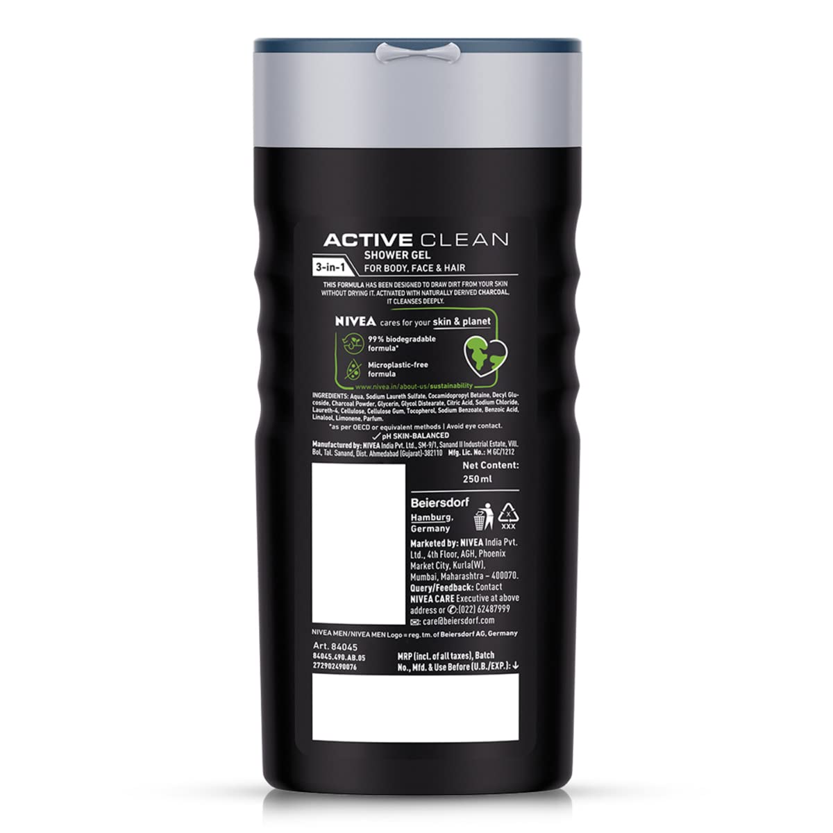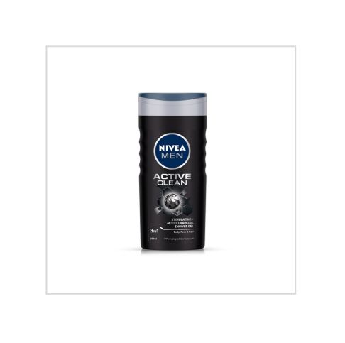 NIVEA MEN Active Clean Shower Gel deep cleanses your body while being mild on your skin. This innovative 3-in-1 shower gel for Body, Face and Hair has natural Active Charcoal which works as a dirt magnet and cleanses your skin thoroughly without drying it out. Let this effective, yet mild gel with masculine scent transform into a white caring foam, which keeps your skin hydrated. Skin tolerance dermatologically proven. HOW IT WORKS Leaves your skin and hair feeling refreshed, revitalized and deeply cleansed. Provides long lasting freshness.