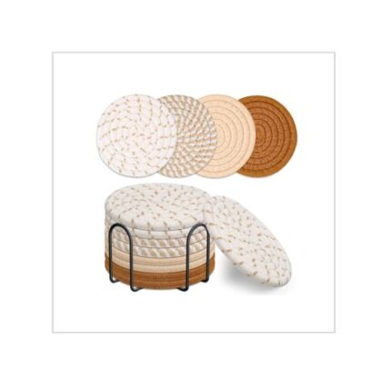 • What You Get: You will get more quantity and more multiple styles coasters from us than any others . You'll get 8pcs round hand-woven cotton coasters (ultra-minimalist style, 4.3") and a 4.3"x3.1" black metal coaster holder.4 colors designs 8pcs in total, which can be used in almost any family scene.