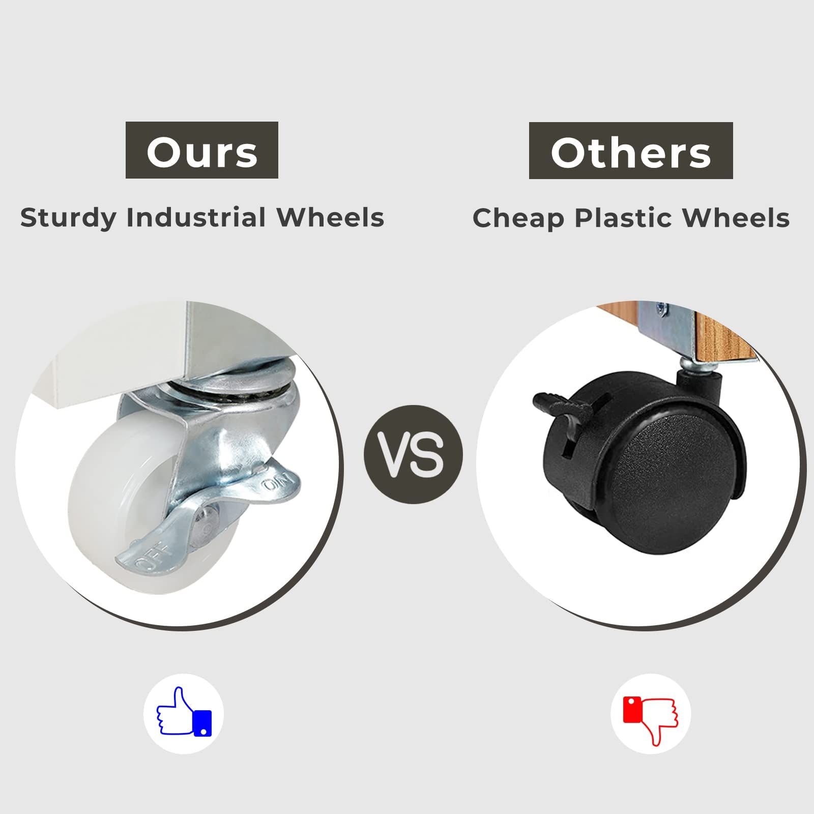 The table has 6 wheels, 4 of them have brakes on them, press the “ON” end of the device to turn the wheels, and press “OFF” to lock it.
